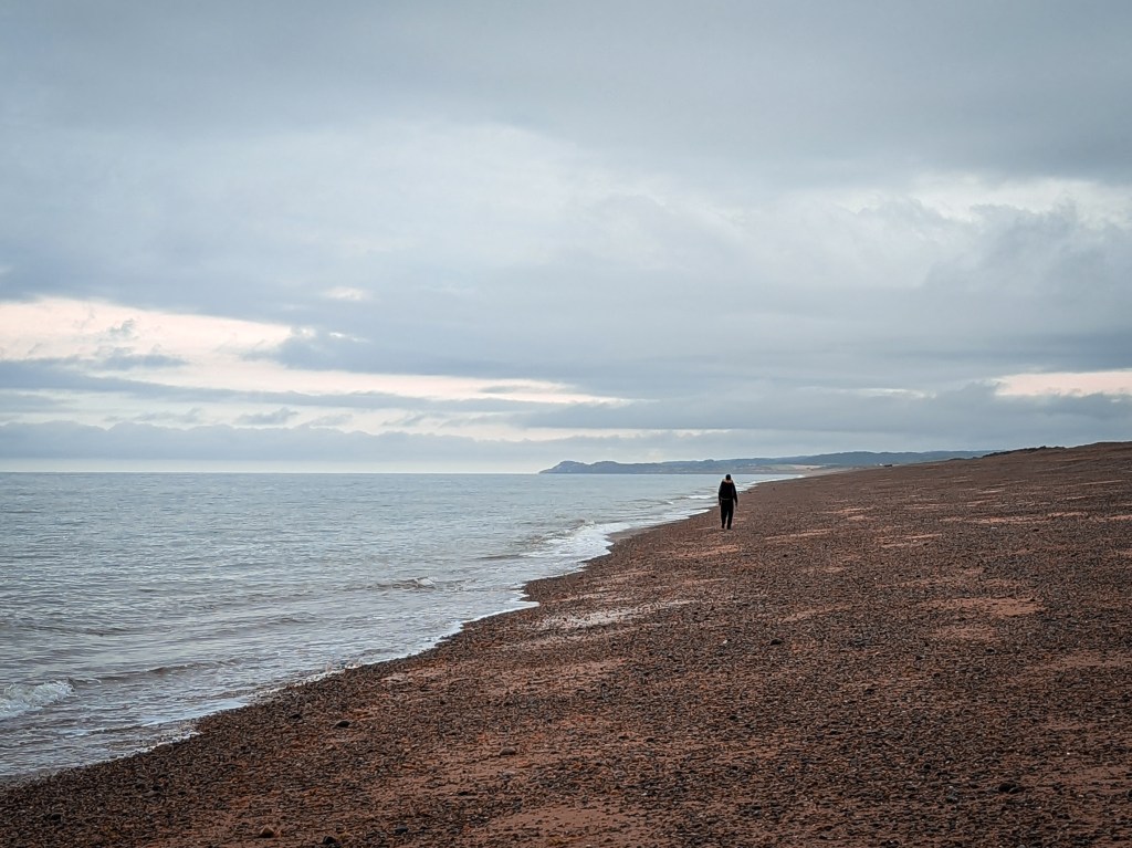 Lunch was the only gift from the weather though, and the rain soon started up again as we left our seats to begin walking. We’d finally reached the end of the raised footpaths through the marshes and would join the beach once more. The beach however was not the golden sand of Holkham like we had seen yesterday but instead miles of shingles. Small, rounded stones would move underfoot. With each step, your feet would move underneath you. This was hard on its own, but with the added weight of the backpack – brutal.