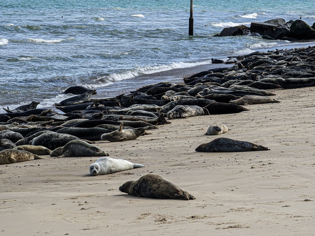 The rest of the day’s walk carried on along the beach, and we made progress with the tide now out. Miles ticked away in the sun, alone on the remote beaches in between each town. Except for one little beach just down the coast from Horsey Gap, where a crowd of onlookers stood, phones in hand pointing to the sea. They stood along a groyne on the beach, so we didn’t see what all the attention was for until we reached the crowd and looked down to see a colony of 100+ seals lying on the beach.